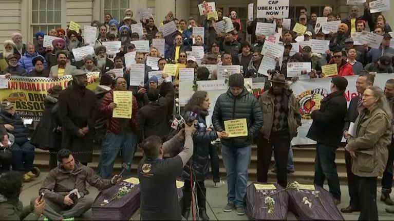 La protesta de los taxistas frente a la alcaldía tuvo un elemento visual impactante: cuatro cajas como ataúdes como símbolo del número de taxistas que se han quitado la vida en los últimos meses debido a las dificultades para sobrevivir con su trabajo de choferes.